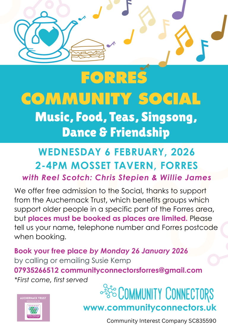 Our Forres Community Socials at the Mosset Tavern, supported by music from Chris Stepien and Willie James (Scotch Reel) and our many volunteers, have been very popular with over-60s in Forres! These Forres Community Socials are aupported by Auchernack Trust, for which we are very grateful.